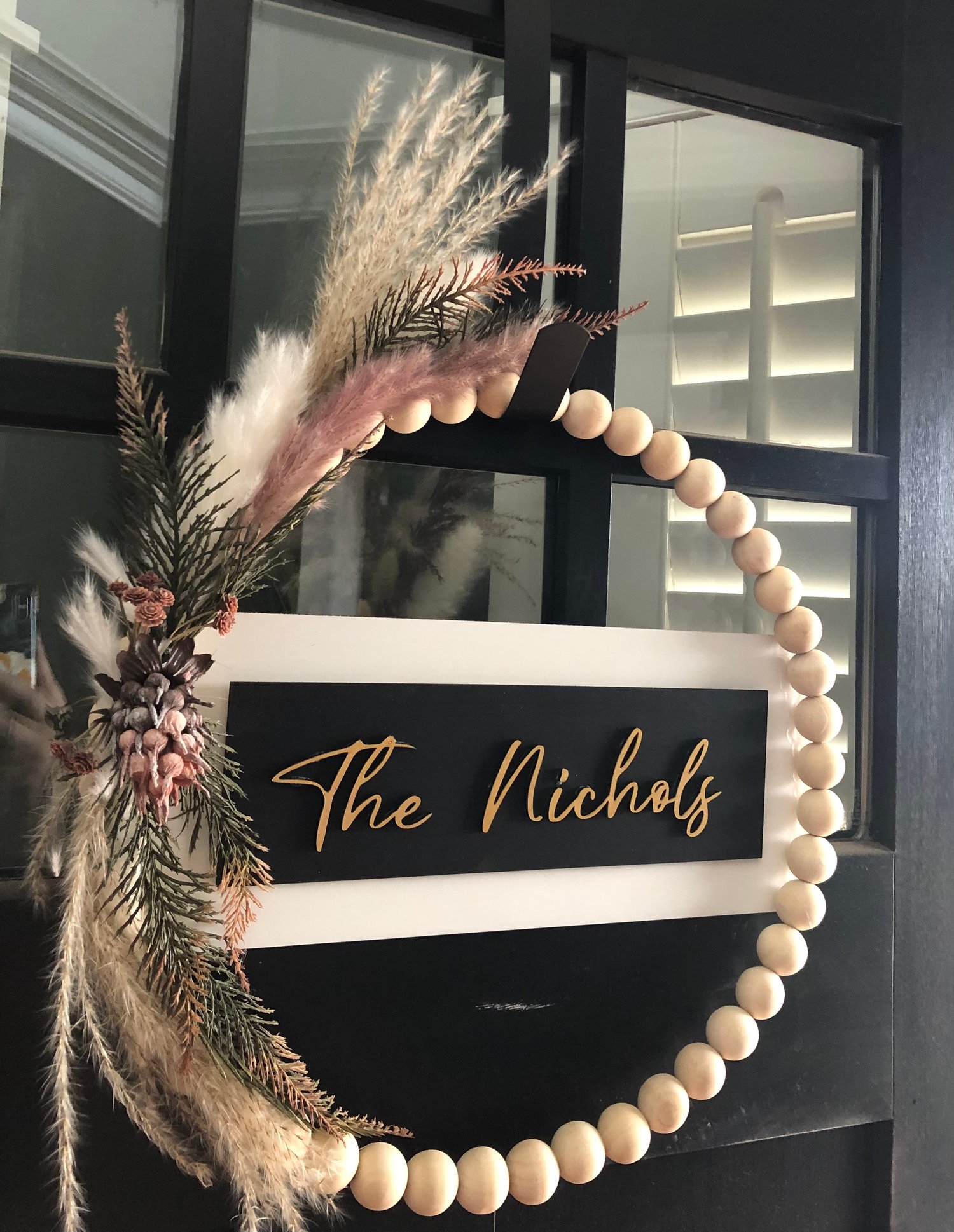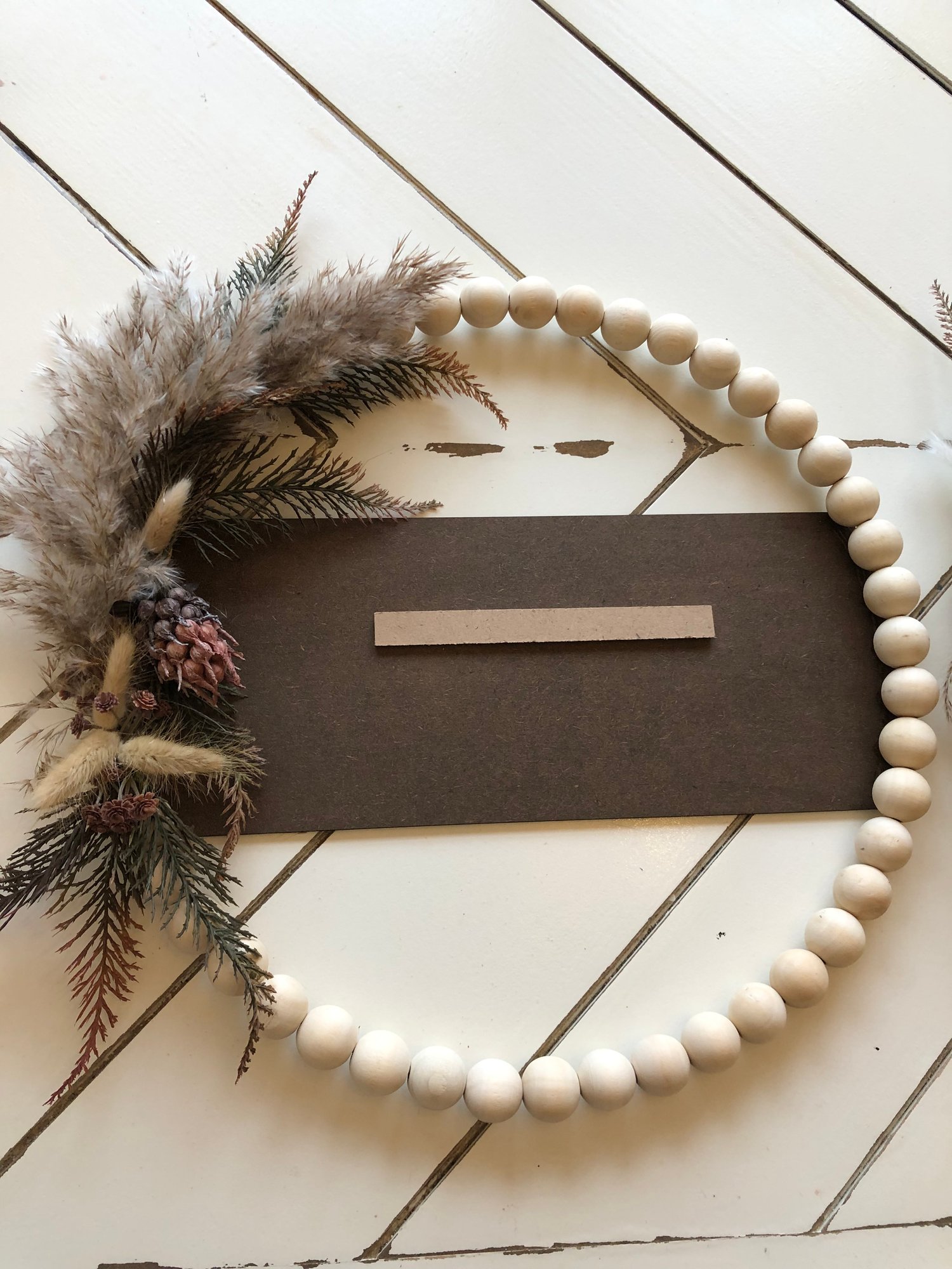 This boho wreath measures 14 inch round featuring boho greenery mixture. Each wreath will be a little different as they are assembled by hand. You can order with a white background or the dark walnut stained background.
