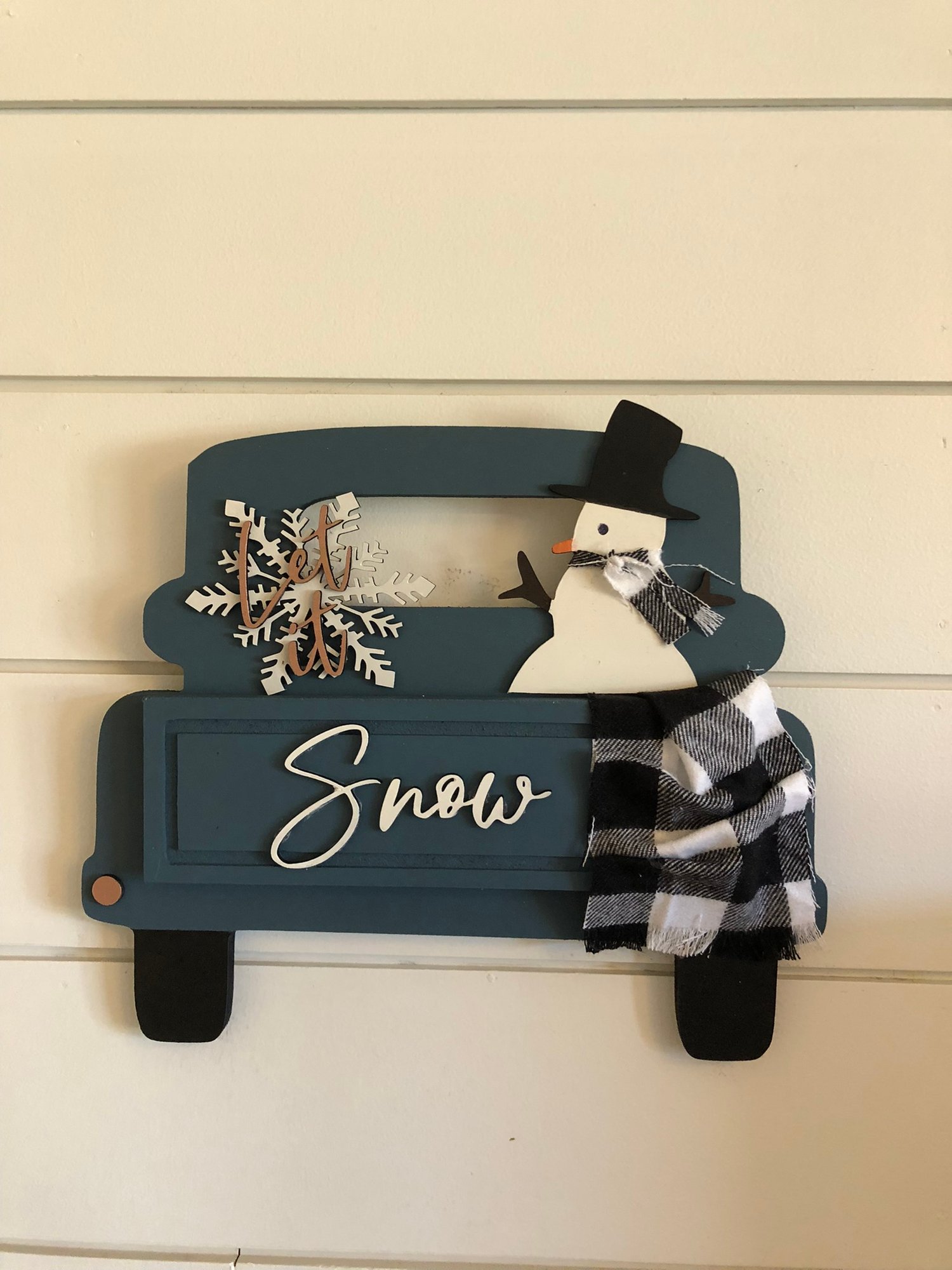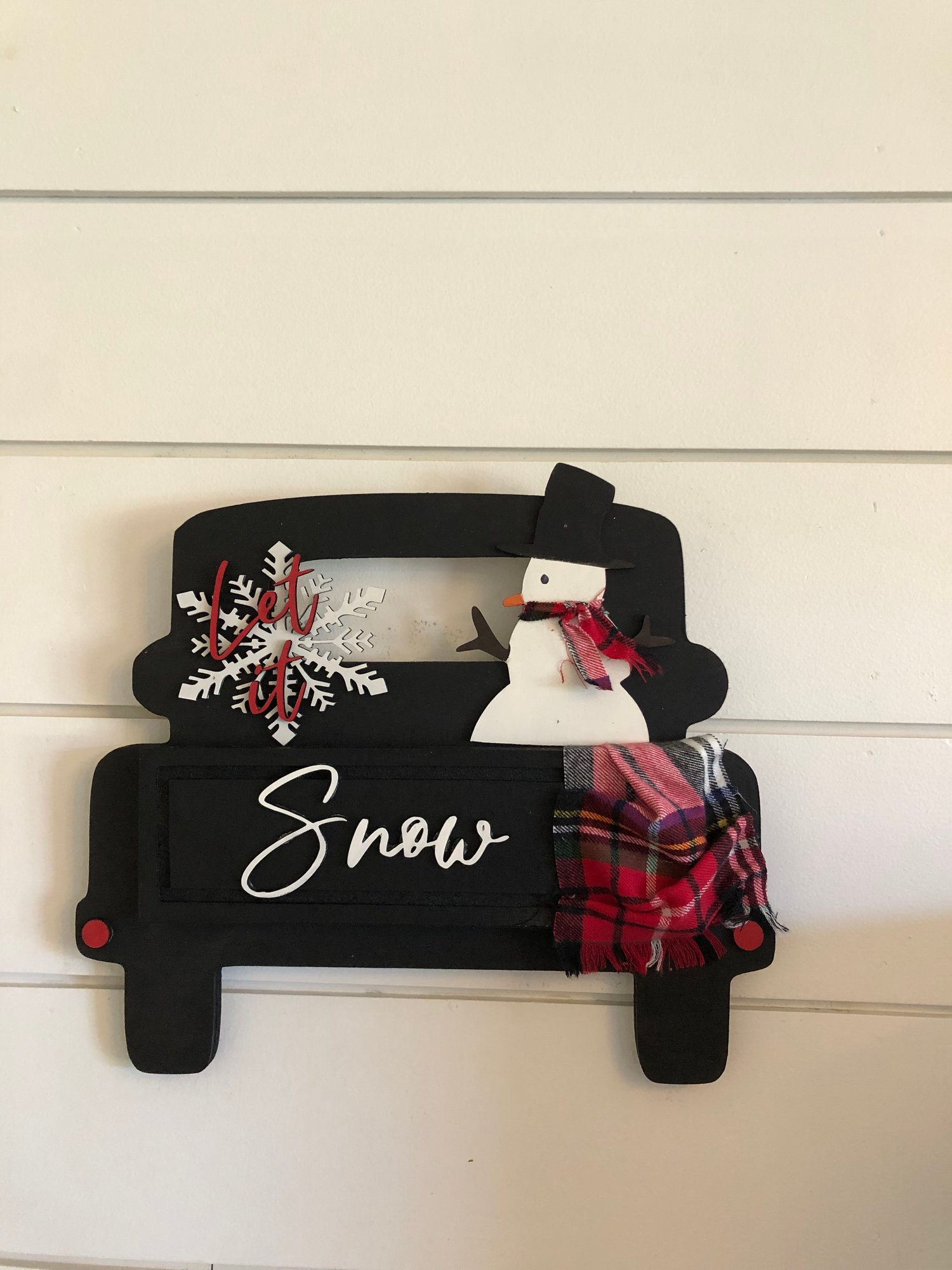 Do you want to build a snowman? lol This truck is prefect to keep up all winter long. The snowman truck measures 13" wide x 10 1/2" tall. The truck features the following in 3D cut outs: Snowflake, Snowman with fabric scarf, and Let it snow. A blanket flows off the back side of the truck.